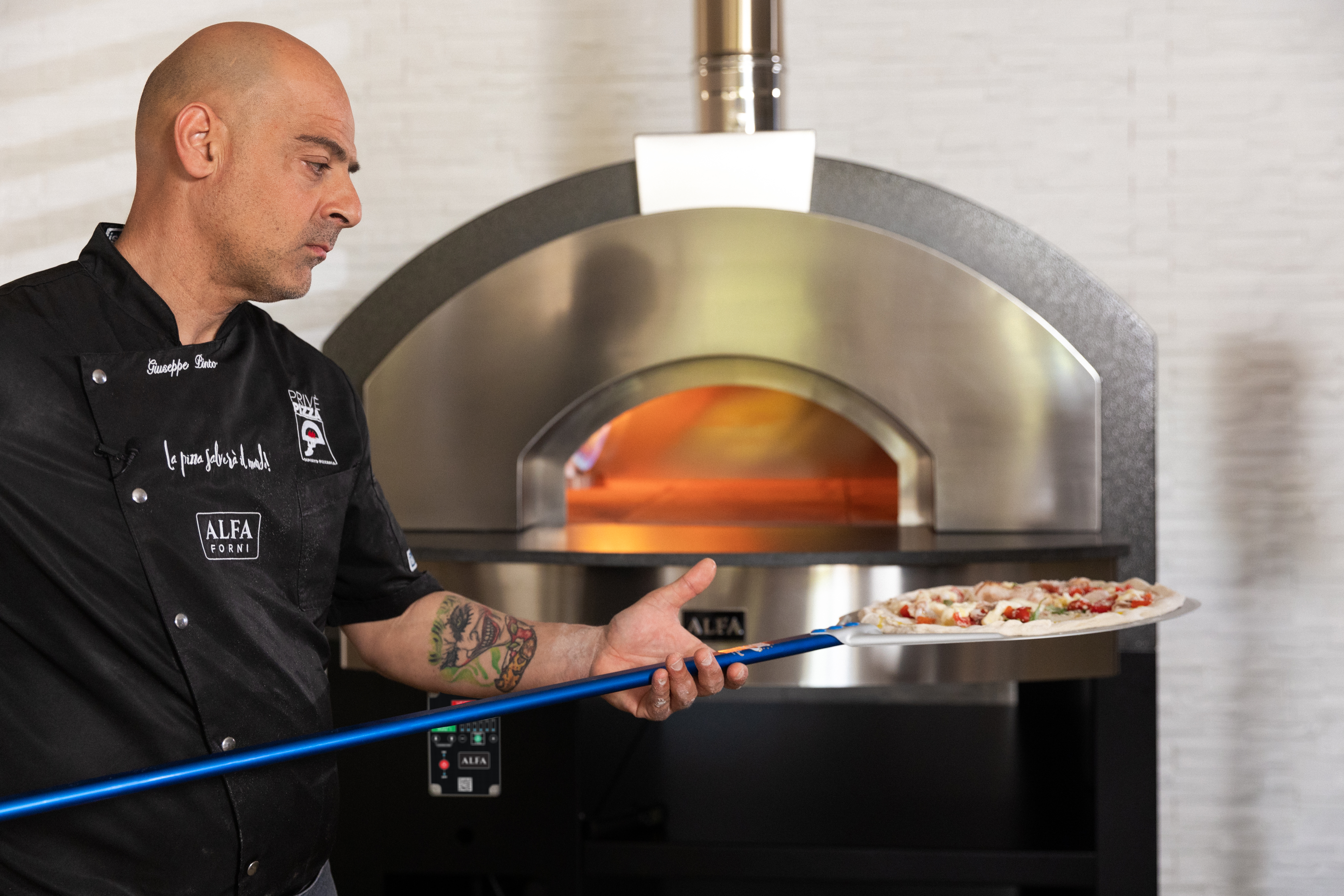 Double front-suction hood reduces heat perceived by the pizza maker by about 20%.